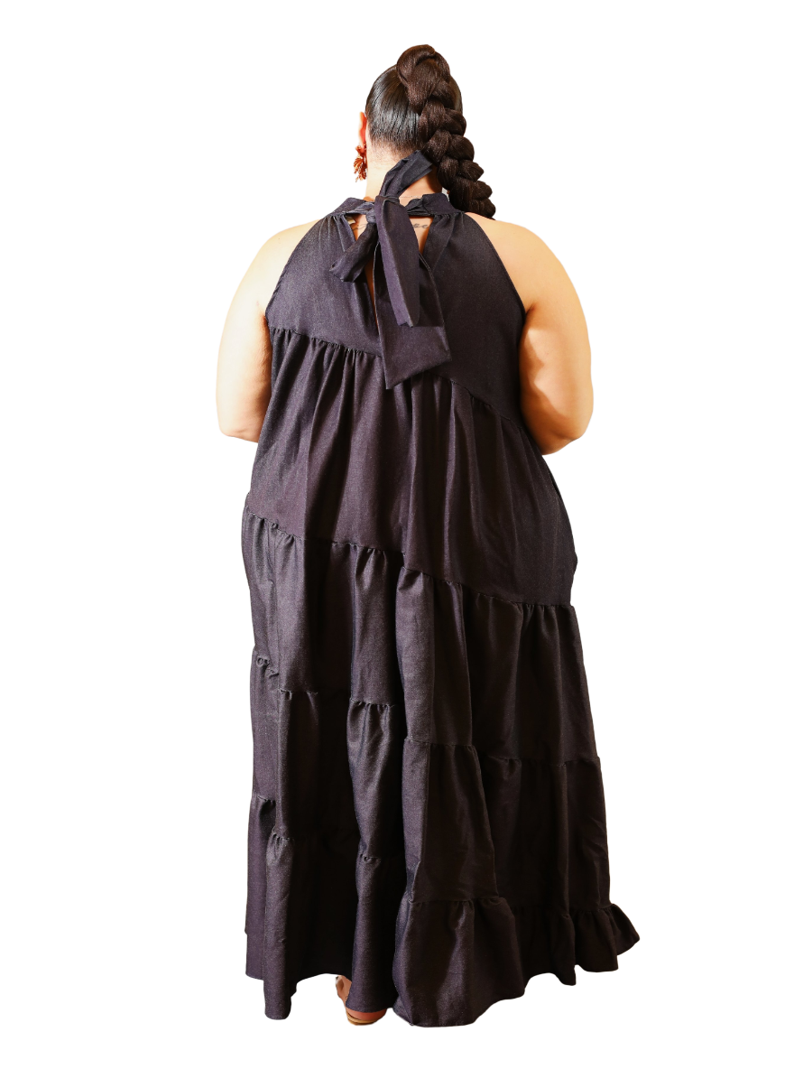 • The Denim Goddess Gown features a flattering halter neckline with tie closure in back.