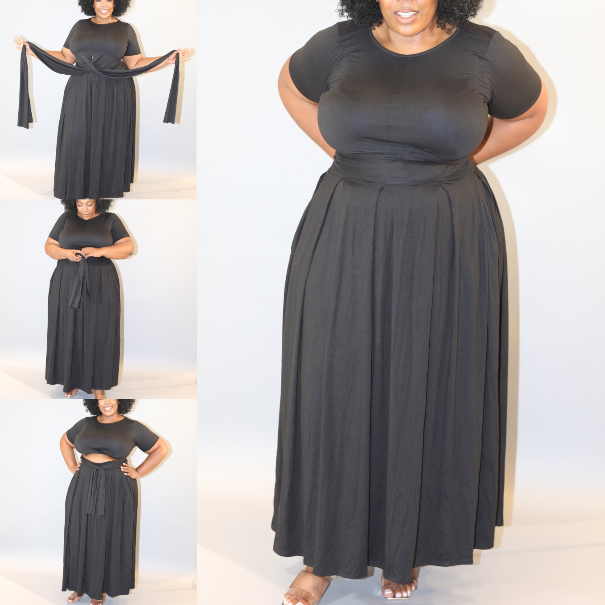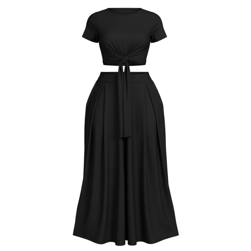 Effortlessly elegant with a soft edge, the Muse Free Style Tie-Front or back Set is the perfect balance of comfort and confidence. This two-piece set features a cropped short-sleeve top with a flattering front tie detail that cinches the waist just right, paired with a flowy, high-waisted maxi skirt designed to drape beautifully over your curves.